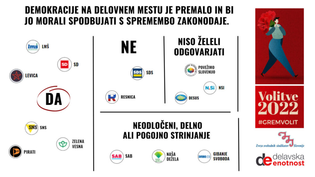 Delimo tudi odgovore političnih strank glede vprašanj, ki so neposredno povezana s sindikalizmom (ali se sindikate dovolj upošteva, ali moramo bolje zaščititi sindikalne zaupnike, ali bi morala zakonodaja bolj spodbujati včlanjevanje v sindikate). Samo v Levici, SD in Vesni so nam na vsa tri vprašanja odgovorili pritrdilno, v SDS in SNS pa z nestrinjanjem in so očitno precej proti krepitvi sindikalizma pri nas. Spomnimo, da nam v Novi Sloveniji, Desusu in Povežimo Slovenijo niso želeli niti odgovoriti.