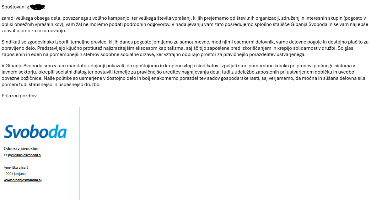 Kakorkoli, vse odgovore in odzive strank (tudi od Demokratov in Gibanja Svoboda) smo obdelali, primerjali z aktualnimi programskimi usmeritvami ZSSS in jih predstavljamo v posebnem grafičnem prikazu, ki ga najdete TUKAJ.