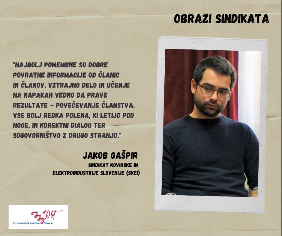 … je predsednik podružnice Sindikata kovinske in elektroindustrije Slovenije (Skei) v posavskem podjetju Athos Elektrosistemi in predsednik Skeieve komisije za mlade. »Dedek je zmeraj pravil, da je vsako delo častno,« svojo sicer kratko delovno pot opiše Jakob, ki ga med drugim izpostavljamo kot obraz sindikata, ker mu je s sodelavci uspelo kot agencijskemu delavcu v nekaj letih poživiti sindikat in okrepiti njegovo moč v podjetju.