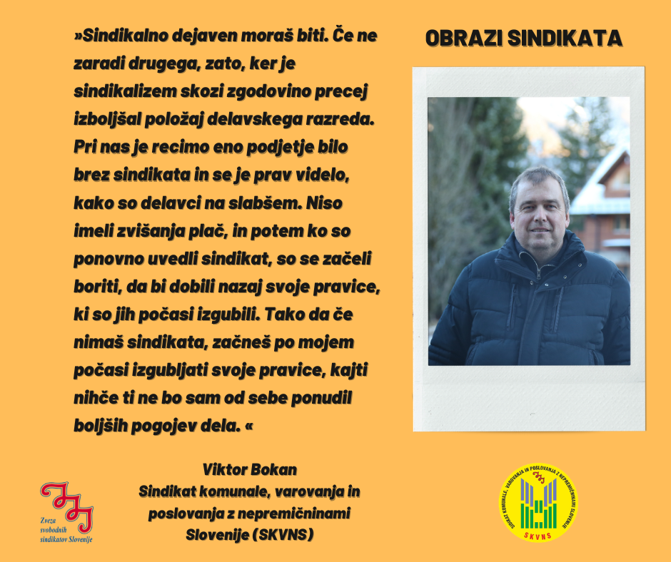 Sindikalno dejaven moraš biti. Če ne zaradi drugega, zato, ker je sindikalizem skozi zgodovino precej izboljšal položaj delavskega razreda. Pri nas je recimo eno podjetje bilo brez sindikata in se je prav videlo, kako so delavci na slabšem. Niso imeli zvišanja plač, in potem ko so ponovno uvedli sindikat, so se začeli boriti, da bi dobili nazaj svoje pravice, ki so jih počasi izgubili. Tako da če nimaš sindikata, začneš po mojem počasi izgubljati svoje pravice, kajti nihče ti ne bo sam od sebe ponudil boljših pogojev dela. Razen mogoče v obdobjih, ko je pomanjkanje delovne sile in delodajalci razmišljajo, kako privabiti nove delavce (nasmešek).