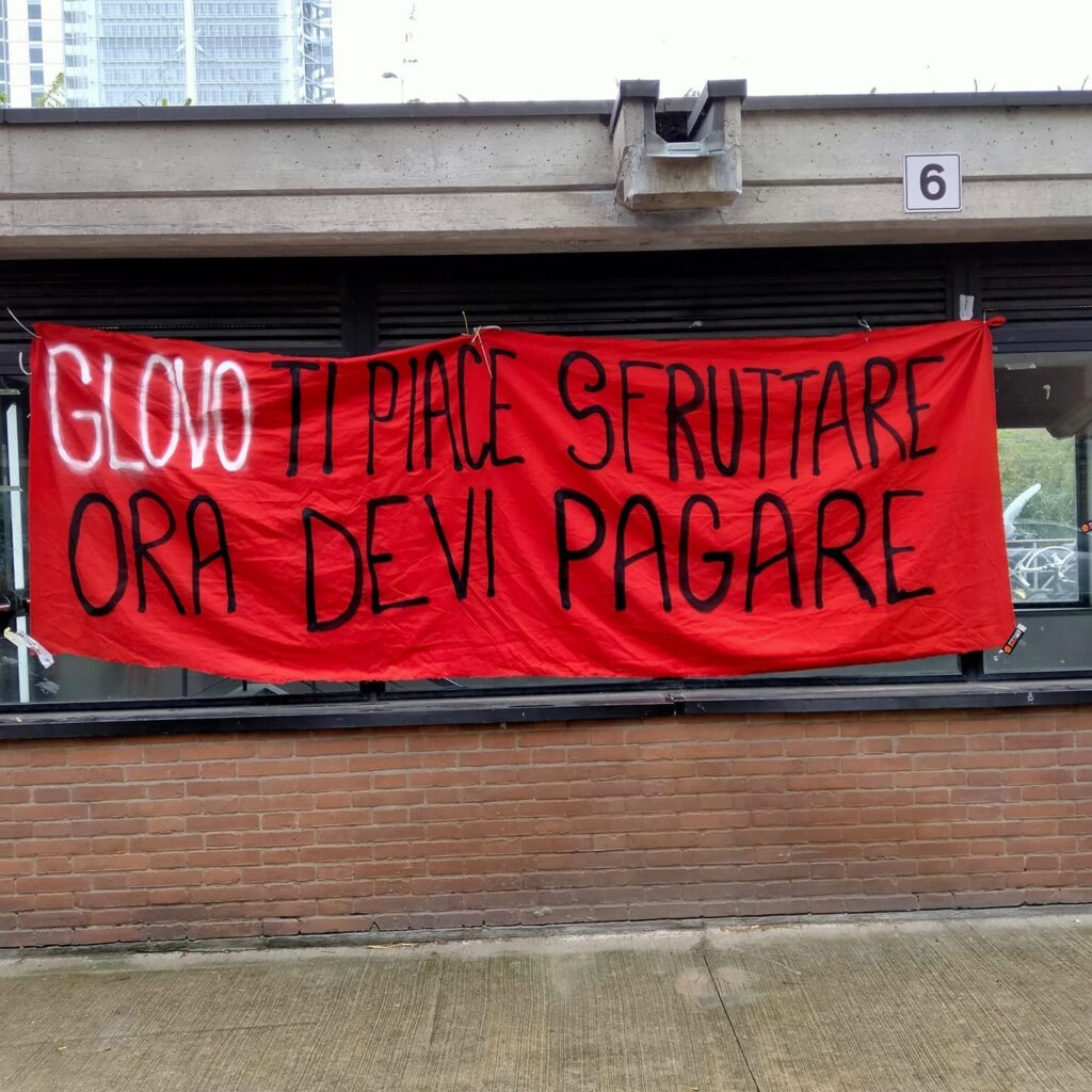 Protestni banner bolonjske iniciative Deliverance ob protestu novembra 2022, ki Glovo spodbuja, k poplačilu svojih obveznosti do delavcev. Foto Deliverance Project/Facebook