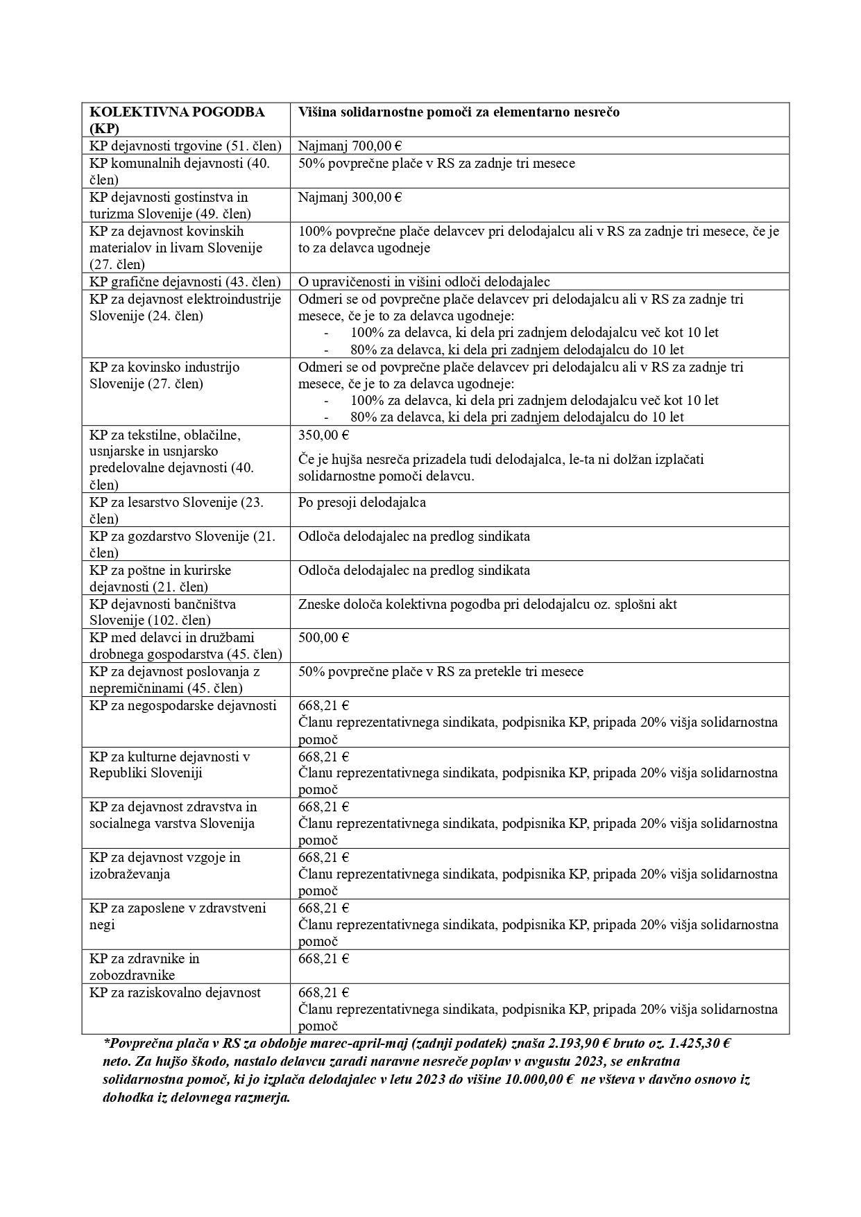V nadaljevanju prilagamo tabelo solidarnostne pomoči, ki jo je zaradi višje sile/naravne nesreče dolžan izplačati delodajalec in njeno višino po kolektivnih pogodbah dejavnosti. Pri tem posebej poudarjamo, da gre za minimalne zneske, določene s kolektivno pogodbo dejavnoti ter da so na ravni posamičnega delodajalca s kolektivno pogodbo na ravni podjetja ali splošnim aktom delodajalca lahko določeni tudi višji zneski. V tem primeru velja za delavca ugodnejši/višji denarni znesek. Za boljšo preglednost dokumenta si naložite priponko: Elementarna nesreča – solidarnostne pomoči, pregled po KP dejavnosti