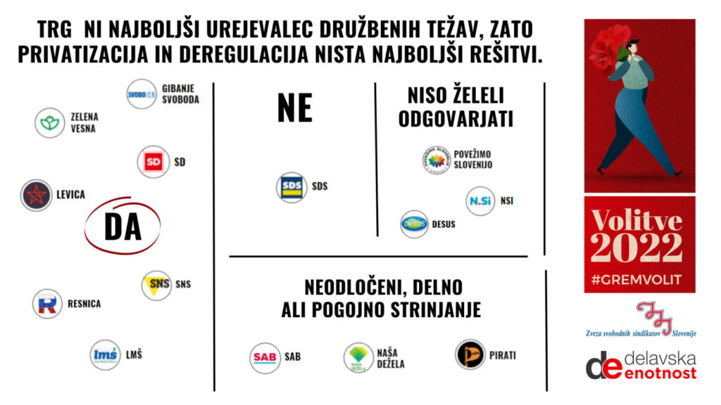 Trg ni najboljši urejevalec družbenih težav, zato privatizacija in deregulacija nista najboljši rešitvi. S to trditvijo smo želeli preveriti, katere stranke najbolj prisegajo na neoliberalne rešitve. Mednje lahko uvrstimo SDS, ki je odgovorila ne, in tudi neodločene stranke Našo deželo, SAB in Pirate.